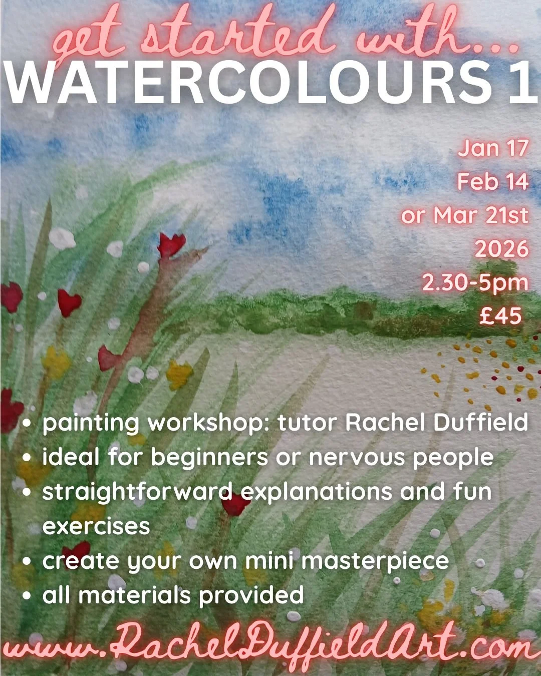 This 2.5 hour workshop will be packed with straightforward explanations and fun exercises, and the opportunity to create your own mini masterpiece using the techniques you've learned. You'll leave brimming with confidence and enthusiasm for the gentle medium of watercolours.