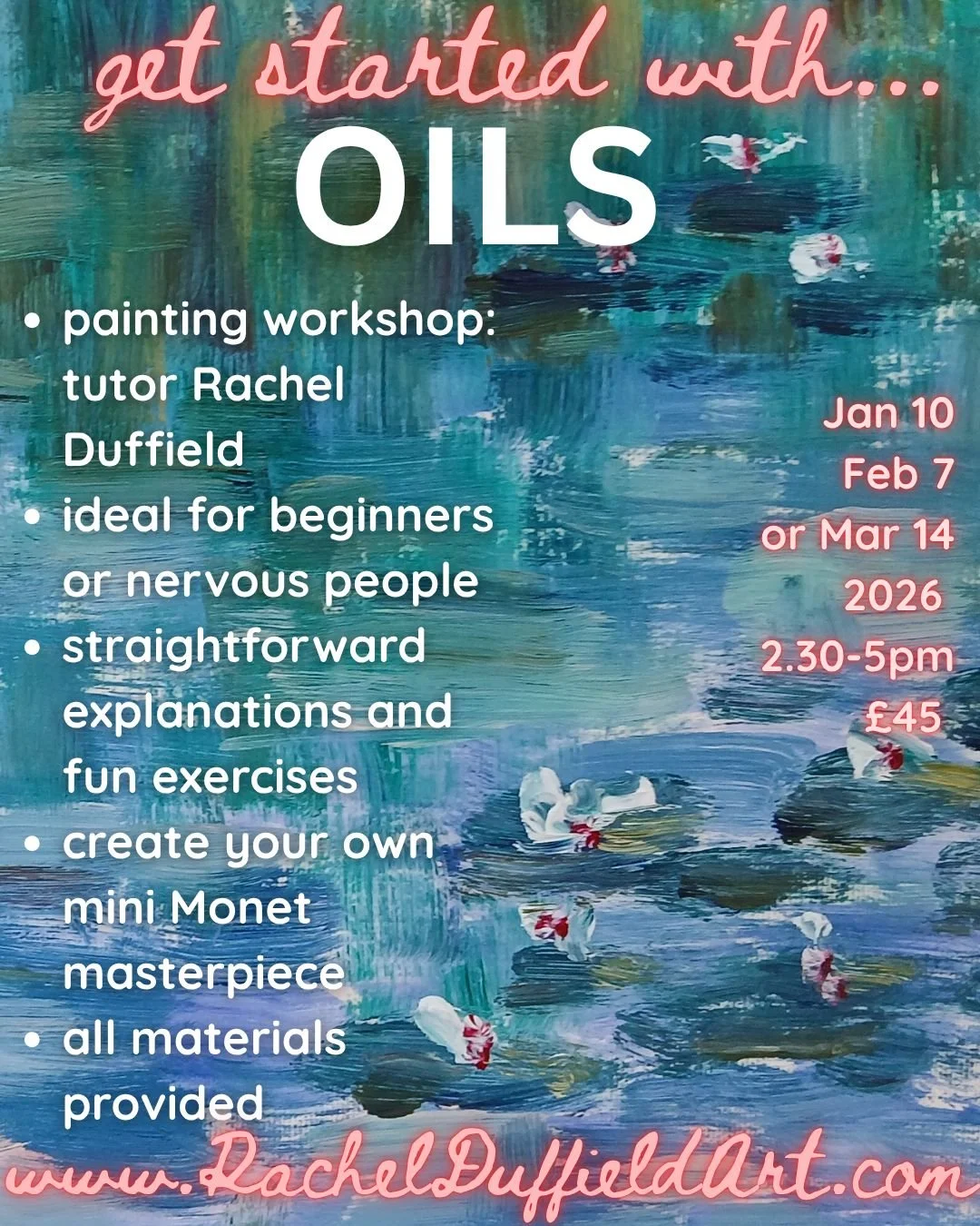 This 2.5 hour workshop will be packed with straightforward explanations and fun exercises, and the opportunity to create your own mini Monet masterpiece using the techniques you've learned. You'll leave brimming with confidence and enthusiasm for the wonderful, adaptable medium of oil paints.